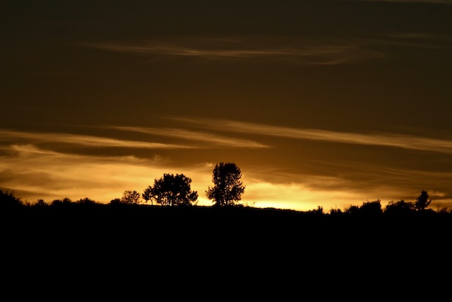 The sun falls, silouetting trees ???